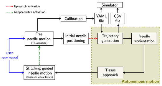 Cooperative human–robot suturing with shared control between the operator and robot has been also explored as an alternative to autonomous suturing. Here, the robot can guide or restrict the surgeon’s command, or execute automated surgical sub-tasks. In [26], the surgeon commands the robot in subtasks where environment interactions are involved, such as grasping or needle insertion, and automatic execution of pre-learned subtasks are executed sequentially after the manual subtasks. Reed et al. [27] developed a robot-assisted steering system for bevel-tip steerable needles by integrating a stochastic roadmap-based planer, a planar controller, and a torsion compensator. During the surgical procedure, the surgeon can either only pause the insertion to verify the needle location or abort the procedure by retracting the needle.