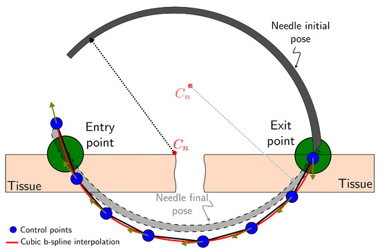 A continuous and differentiable position and orientation trajectory is generated by cubic b-spline interpolation of the control points from the optimal stitching needle trajectory obtained in Section 2.2 (see Figure 6) as