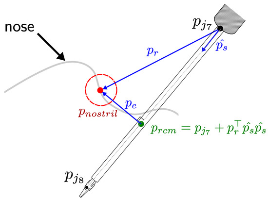 Figure 7 depicts the variables used in the RCM Jacobian computation. The unit vector with represents the direction of the forceps shaft and is the vector between the nostril and the base of the forceps shaft. We can compute the RCM position by