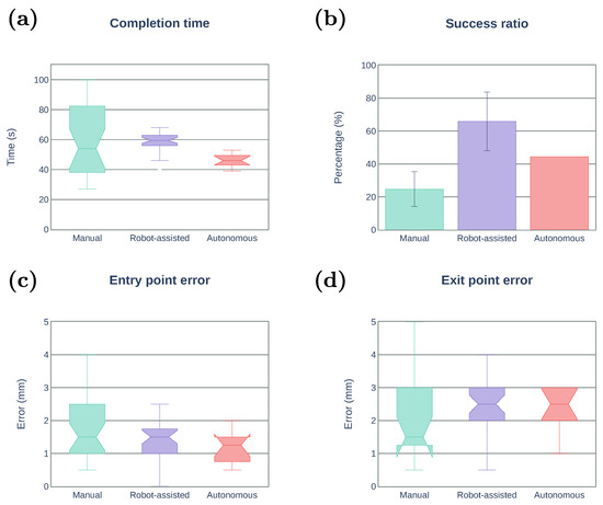 Figure 10 summarizes the results obtained for the three stitching modes (manual, robot-assisted, and autonomous). The number of trials and success ratio per subject are presented in Table 2, Table 3 and Table 4. Note that the task completion time, entry point error, and exit point error are computed only for the successful trials. Figure 10a depicts the task completion time. The reliability of using the robotic system is evident as the standard deviation is greatly reduced compared with the manual operation. The median time for the robot-assisted is about 25% longer than that of the autonomous mode. However, there was no significant improvement with respect to the manual operation. Figure 10b shows the success ratio of the stitching task, where the robot-assisted mode achieved the success ratio of 65.3%, much higher than that of the autonomous mode (43.8%) and the manual operation (25.4%). Needle–tissue interaction forces arising at the needle tip may induce undesired changes in the needle orientation, which could result in a failed attempt to penetrate the tissue. Unlike the autonomous mode where the speed is fixed, the robot-assisted mode allows the user to freely control the insertion speed and reduce the effect of such interaction forces. Moreover, in the robot-assisted mode, the user can also retract the needle along the optimal trajectory if proper penetration is not achieved (e.g., because of tissue deformation). The needle can be pulled back and reinserted without the need of recomputing the optimal trajectory as long as the needle orientation with respect to the forceps tip has not changed. As a consequence, the robot-assisted mode can require additional time to complete the task compared with the autonomous method. Therefore, a trade-off exists between assuring proper tissue penetration and the stitching completion time. Figure 10c,d depicts the entry/exit point error. The autonomous mode showed the smaller entry point error among the three cases, but no improvement in exit point error can be observed when using the robotic system. This is expected, as the stitching trajectory generation algorithm will try to keep the changes in the curvature bounded to facilitate tissue penetration and reduce tissue deformation, which can produce a larger deviation from the desired exit point. By increasing the allowed range of curvature changes, the exit error is expected to be reduced, but higher forces might be generated.
