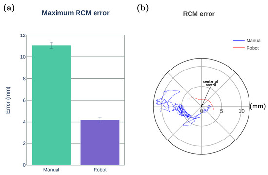 We evaluate the constrained motion planning performance by the maximum RCM error defined as the minimum distance between the nostril and forceps shaft. The RCM constraint implemented for the robotic operation (including robot-assisted and autonomous modes) was able to keep the maximum RCM error below 4.2 mm as shown in Figure 11a. Figure 11b illustrates an example of the forceps displacement from the center of the nostril during task execution by one of the participants. The blue line represents the position of the forceps shaft intersection with the nostril plane for the manual operation, and the red line represents the intersection trajectory obtained when using the robotic system.