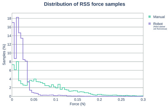 Distribution of RSS force samples. In robot operation (robot-assisted and autonomous modes), approximately 90% of the RSS force samples are within the range of [0, 0.05] N. For the manual operation, the 90% of the samples are within the range of [0, 0.15] N.
