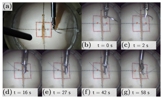 Figure 13a depicts the needle positioned into the stitching workspace. An example of the complete stitching sequence achieved with the robot-assisted mode is shown in Figure 13b–g, with a total duration of 58 s. The user initially placed the needle close to the entry point (t = 0, Figure 13b) and activates the robot-assisted stitching sequence. An optimal trajectory is generated with an initial needle tip pose. The robot reorients the needle (Figure 13c) and approaches to the entry point located over the tissue (Figure 13d). Under the user control, the needle penetrates the right tissue (Figure 13e), commands the needle under the tissue toward the exit point (Figure 13f), and finally penetrates the left tissue from underneath (Figure 13g).