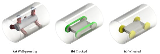 - Okada, T.; Kanade, T. A three-wheeled self-adjusting vehicle in a pipe, FERRET-1. Int. J. Robot. Res. 1987, 6, 60–75. [Google Scholar] [CrossRef]