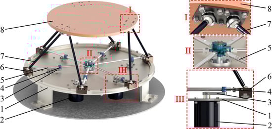Let us consider the structure and functional features of the proposed 6-DOF manipulator with a circular guide. Figure 1 presents its CAD (computer-aided design) model (virtual prototype). The model allows not only to fabricate its physical prototype but also to perform numerical calculations and experiments. The operation of the CAD model is presented in the movie in Supplementary Materials. The key elements in Figure 1 are: 1—circular guide (fixed link); 2—drive; 3—crank; 4—slide block; 5—swinging arm; 6—carriage; 7—leg; 8—platform (end-effector). Slide block 4 and swinging arm 5 form a prismatic joint, swinging arm 5 and carriage 6 form a single link (rigid connection), leg 7 is connected on both sides with carriage 6 and platform 8 by spherical joints. Figure 1 also demonstrates the main constructive assemblies of the manipulator: I—the coupling of leg 7 and platform 8 through spherical joints; II—the coupling of six swinging arms 5, which converge in the center of circular guide 1 and have a common rotational axis; III—the coupling of links 1–6.