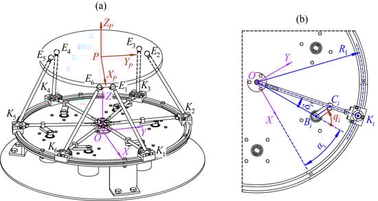 The position of the end-effector can be described by the Cartesian coordinates of any of its points, for example, its center, point P (Figure 2a). These coordinates can be represented as vector pP that determines the position of point P relative to global coordinate system OXYZ. Plane OXY is in the plane of carriages Ki, i = 1 … 6, and the center, point O, corresponds to the intersection point of the circular guide axis with this plane. The end-effector orientation can be set using rotation matrix RP, which determines the orientation of local coordinate system PXPYPZP attached to the end-effector relative to global coordinate system OXYZ.