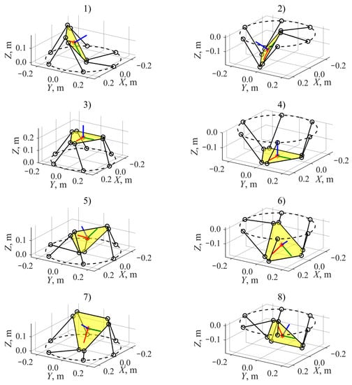 This procedure was realized automatically using Bertini program [34], implemented in MATLAB package as BertiniLab interface [35]. As a result, 28 different solutions were obtained: 8 real and 20 complex. These eight real solutions correspond to eight different assembly modes of the manipulator and are shown in Table 1 and Figure 3. Assembly mode #3 corresponds to the specified end-effector configuration from the previous example. Note that half of the assemblies have a symmetrical analog located on the other side of plane OXY.