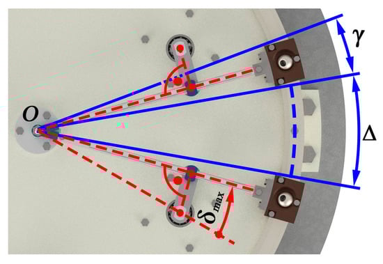 As mentioned in Section 2, the correctly chosen cranks lengths allow eliminating the possibility of collision between the adjacent carriages. Let us address this problem in detail. Let’s consider the symmetrical geometry of the manipulator as in the previous examples: all the cranks have length l and their rotational axes are located evenly on a circle with radius d. Suppose that the carriages have angular width γ, and the distance between the adjacent carriages when they are in extreme positions is Δ (Figure 4). In this configuration, each crank is perpendicular to the corresponding swinging arm. Each of the arms rotate on its maximum angle δmax, so: