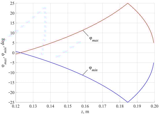 Maximum and minimum values of rotational angle φ around the vertical axis depending on platform height z; red line indicates φmax, blue line indicates φmin.