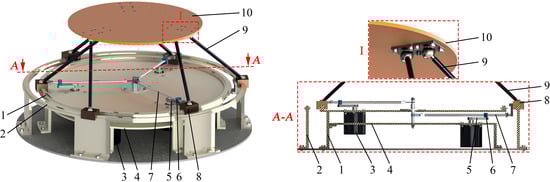 Figure 6 presents such a variation of the proposed design with two circular guides. The swinging arms can rotate at higher angles leading to the increased value of platform rotational angle φ. Here are: 1—inner circular guide (fixed link); 2—outer circular guide (fixed link); 3—drive; 4—support for drive 3; 5—crank; 6—slide block; 7—swinging arm; 8—carriage; 9—leg; 10—platform (end-effector). The proposed design requires location of the centers of spherical joints 9–10 according to view I in Figure 6, where each pair of these joints is on the same radius of the platform. To provide higher rotational angle φ, three kinematic chains of links 5–7 are moved under the circular guides (section A-A in Figure 6). For the presented design, the maximum value of rotational angle φ is about 55°, which is comparable to the Gough-Stewart platform.