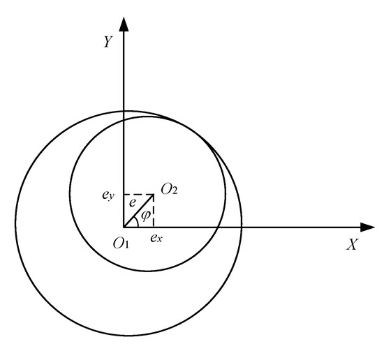 To facilitate the study, the clearance of the revolute joint was simplified to the clearance between the rotating shaft and the sleeve, as shown in Figure 2. The center distance between the rotating shaft and the shaft sleeve is denoted as vector . The projection of the clearance vector in the X axis direction is denoted as , and the projection of the clearance vector in the Y axis direction is denoted as .