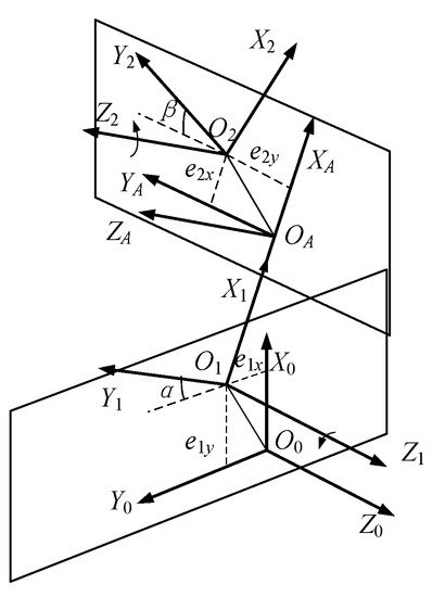 and opposite to the direction of gravity, and the axis is determined by the right-hand rule. The coordinate system of link 1 is . is the origin of the coordinate system. The projection of in the X0axis direction is , and the projection of in the Y0 axis direction is . In the same way, the coordinate system of shafting 2 can be established such that represents the rotational angle of shafting 1 and represents the rotational angle of shafting 2.