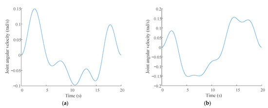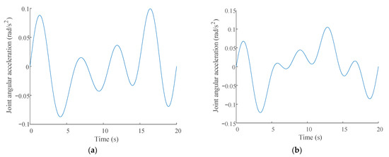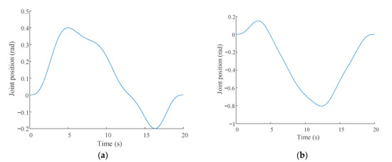 It can be seen from Figure 5, Figure 6 and Figure 7 that the excitation trajectories of the X–Y pointing mechanism were relatively smooth. The trajectories passed through most of the working space, and the motion of each joint was within the constraint range. It was further proved that when the excitation trajectories were adopted as finite Fourier series, the joint angular velocities, joint angular accelerations, and joint torques of the X–Y pointing mechanism maintained stable working conditions. The trajectories had good anti-interference performance.