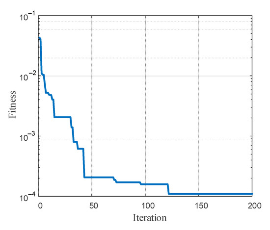 Parameter identification was carried out with the ABC algorithm in MATLAB 2018b programming environment on an Advanced Micro Devices (AMD) Core R5-4600U PC running Windows 10. No toolbox was used. In a certain range, as the size of bees increased, the algorithm generated better results. The maximum number of iterations was set to 200. When the fitness value was less than 10−6, the operation was completed. The number of employed bees was 100, the number of onlookers was 100, and the acceleration factor was 0.5. The dynamic parameter identification and convergence process of the ABC algorithm is shown in Figure 8. When the number of iterations reached about 200, the fitness function gradually converged and the fitness value became less than 0.002. It can be seen that the dynamic parameter identification based on the ABC algorithm had the characteristics of a fast convergence speed and a high calculation accuracy.