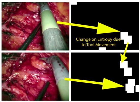 The figure depicts the change in the binarized entropy map due to the movement of the surgical instrument. The surgical instruments including the surgical robotic arm located at the right-hand side of the scene and the black arm is the suctioning tool.