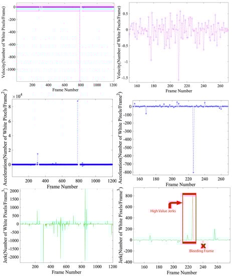 As an example, Figure 2 shows graphically the entire process of how our algorithm computes local entropy change to predict bleeding over time for video number 6 in Table 4. This figure indicates that the number of white pixels in the binarized masked RGB frame over time. As can be seen, there are spikes on the jerk, which correspond to the sharp movement of surgical tools. We used the dynamics of homogenous instrument regions (their velocity, acceleration, and jerk) to extract information about abrupt movements of instruments. The first, second, and third rows of Figure 2 represent the velocity, acceleration, and jerk of the instrument regions (white pixels in Figure 1). The last row also illustrates a correlation between the spikes on the jerk graph and the occurrence of bleeding. Note that the frame number where the bleeding occurs (marked with an X) is preceded by high jerk values.