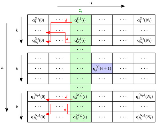 where is the local cost to move from node on grid h to the node on grid g, while is the maximum order derivative for which a constraint is defined; for instance, if acceleration constraints are imposed, . A pictorial view is given in Figure 2 for . For each enabled node at (in blue), an optimal predecessor is selected among those that belong to (in green) by solving the local optimization problem in (14). Higher-order constraints yielding are checked by using the chain of d predecessors represented by the red arrows, which allows computing the discrete approximations of derivatives.