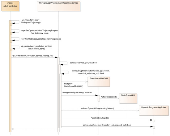 Our moveit_dp_redundancy_resolution package, publicly available on the Internet [25], constitutes an additional move_group capability, which is offered to the MoveIt! users through a ros::ServiceServer. Specific messages, called GetOptimizedJointsTrajectory, are exchanged through the service interface. The user can be any ROS node that implements a ros::ServiceClient interface and is able to assembly and send a GetOptimizedJointsTrajectoryRequest.
