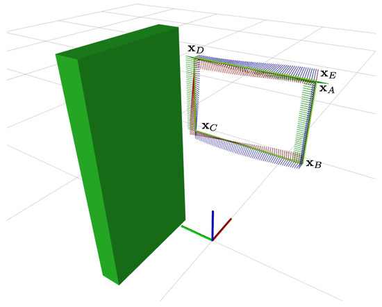 The workspace path is defined in terms of position and orientation and is depicted in Figure 6, together with the base reference frame and the obstacle. The axes x, y and z are in red, green and blue respectively. The planning is performed for the end-effector’s flange that has to visit five waypoints, in the order , , , and , describing the corners of a rectangle in the y-z plane, with variable orientation. Their values with respect to the base reference frame, considering a roll-pitch-yaw representation for the orientation, are