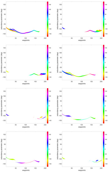 The “augmented” kinematic function in (9), also termed node function, is equivalent to a standard inverse kinematic function of a non-redundant manipulator, meaning that is not unique, but a finite set of solutions exists. The number of such solutions only depends on the mechanical characteristics of the manipulator and is equal to 2, 2, 4 and 16 for planar, spherical, regional and spatial manipulators respectively [17,18]. However, for some specific kinematic structures, as well as for some specific trajectories [19], the actual number of solutions could be less than the maximum theoretical value. For instance, for most six-axis industrial manipulators, the number of distinct configurations is equal to 8 [11]. Multiple inverse kinematic solutions imply the existence of multiple grids. Therefore, let us rewrite Equation (9) to make the grid index g explicit:
