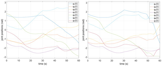 The solution obtained for is reported in Figure 9 (left). It starts from grid 5 (i.e., , , ), then, at s (), it jumps to grid 6 (i.e., , , ) and, at s (), to grid 1 (i.e., , , ). For the majority of the trajectory, up to s (), the solution lies on grid 1. Afterwards, it transits to grid 2 (i.e., , , ) and terminates, achieving 3 posture reconfigurations in total and visiting 4 different extended aspects. As commented in Section 2.3, posture reconfigurations always happen on the boundaries of the feasible (non-white) regions, where two or more of the maps have the same color for all the joints (only is shown in Figure 7). It is easy to verify that this is the case for the sequence of grids visited by the algorithm and transitions at the stages mentioned above.