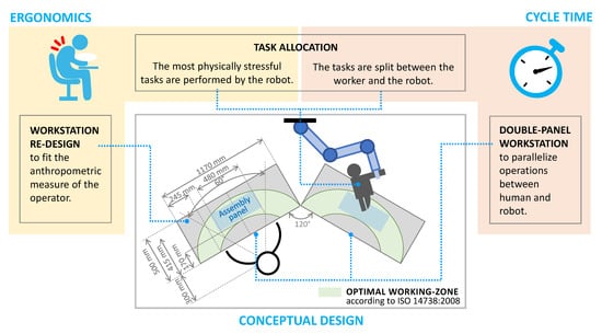 - Gualtieri, L.; Palomba, I.; Merati, F.; Rauch, E.; Vidoni, R. Design of Human-Centered Collaborative Assembly Workstations for the Improvement of Operators’ Physical Ergonomics and Production Efficiency: A Case Study. Sustainability 2020, 12, 3606. [Google Scholar] [CrossRef]