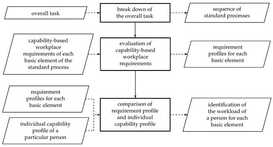 The proposed approach provides a three-step procedure. As seen in Figure 1 the three steps consist of “break down the overall task in standard processes”, “evaluation of capability-based workplace requirements” and “comparison of requirement profiles with the individual capability profile” of a particular person. The following chapters will explain the mentioned steps in detail.