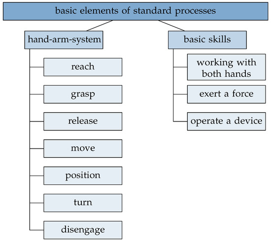 Each standard process is defined by a particular set of basic elements. These basic elements are based on the 19 fundamental motions of Method Time Measurement (MTM) analysis representing a common approach in workflow modelling [10]. Besides the fundamental motions of MTM the following three basic elements “working with both hands”, “exert a force” and “operate a device” are implemented to describe standard processes. The basic element “working with both hands” signalizes that the standard process is composed of a parallel and/or divided task requiring the use of both hands. The basic element “exert a force” describes the use of a force through fingers, hand or arm to overcome resistance without a significant movement. Therefore, it combines the fundamental motions “push” and “pull” within one element. “Operate a device” is dependent on the device that a person needs to use. Thus, the requirements for this basic element depends on the used device, respectively, tool. All in all the description of standard processes requires the fundamental motions of the hand-arm-system of MTM and the presented three basic elements, see Figure 3.