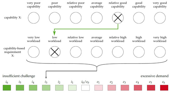 For reasons of evaluation, the rated capability profile is referenced to the rated requirement profile of each basic element belonging to the needed standard process of the overall task. The differences between capability-related requirements and capabilities resulting from the comparison indicate an existing excessive demand and/or insufficient challenge in the evaluated characteristics. The extent of excessive demand or insufficient challenge is also returned through the comparison, as can be seen in Figure 6 and Figure 7. Required capabilities, in which a person is overloaded or even not challenged enough, are then taken into consideration for a robot assistance in the design process of the inclusive HRC workplace.