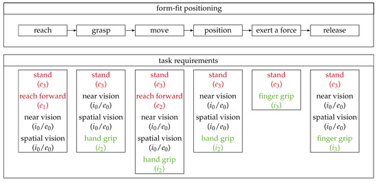 Finally, the requirements that cause the participant to be under challenged are listed. These mostly include one-sided “hand grip” and “finger grip” and are needed for all basic elements except “reach”. Requirements, in which a person is insufficiently challenged, have to be evaluated individually. In these cases, a collaborative robot could be used as an assistive device. The level of insufficient challenge and mental state of an individual is crucial. A requirement that is insufficiently challenging physically could still be difficult mentally. Basis for this decision is always self-actualization and satisfaction of the individual. At the moment, capability- based requirements, in which the person is insufficiently challenged, are planned to be executed by the participant. The results of the profile comparison for the standard process “form-fit positioning” are summarized in Figure 8.