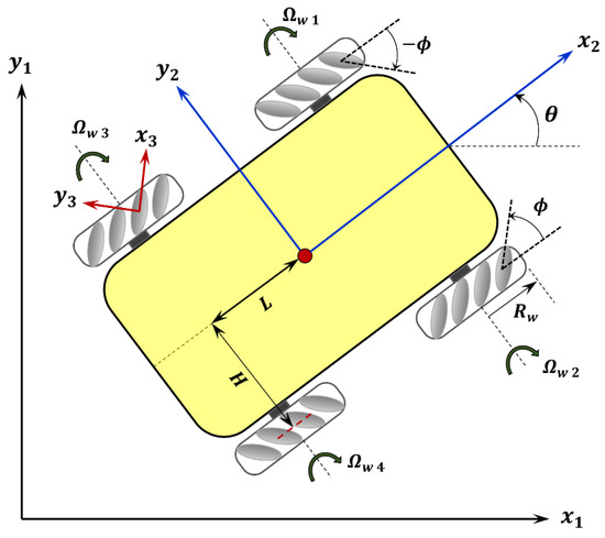 where is the radius of wheels. It is assumed that the rollers of the Mecanum wheels is rolling without slipping on the ground. Therefore, the velocity of the contact point of each roller with the ground is zero and the linear velocity of rollers’ center could also be determined using Equation (7).