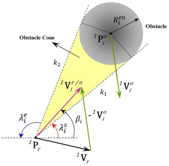 where and are unit vectors along x and y axes of frame {1} respectively. By defining the collision cone and relative velocity for each obstacle in time , the collision avoidance criterion in each time instant is simply to prevent the robot from moving with the relative velocity vector inside the obstacle cone (Figure 2). The VO set associated with ith obstacle at time is defined as follows.