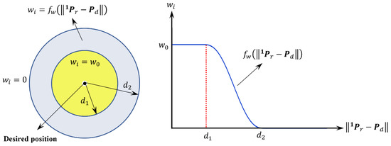 where is a constant final weights value, and are radius of two small circular region around the desired position, denotes target position and is a scalar function that should be continuous and two time differentiable at and . The geometrical interpretation of Equation (57) is illustrated in Figure 4 in which the weight of position error is constant value and the weights of other state variables increase from their initial value 0 to their final value when the robot enters into a small neighborhood of the desired position.