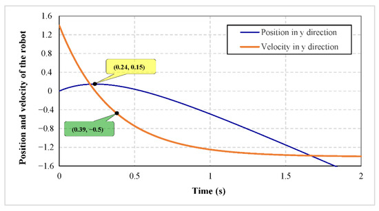 The parameters and functions used to design the feedback control system in Equation (43) should be specified in which the convergence of the state variables to desired values and the acceptable performance of the obstacle avoidance strategy are guaranteed. Since the feedback control input is calculated based on the position and velocity of active obstacles, it is also assumed that the position and velocity of obstacles at time are such that it is possible for the robot to remain inside the workspace boundaries (constraints in Equation (45)) and move towards the target position in without collision. The first part of this assumption could be written mathematically as follows: