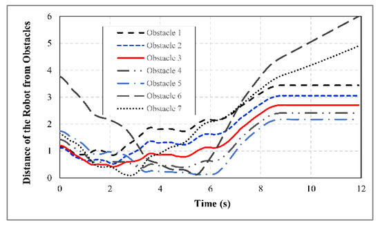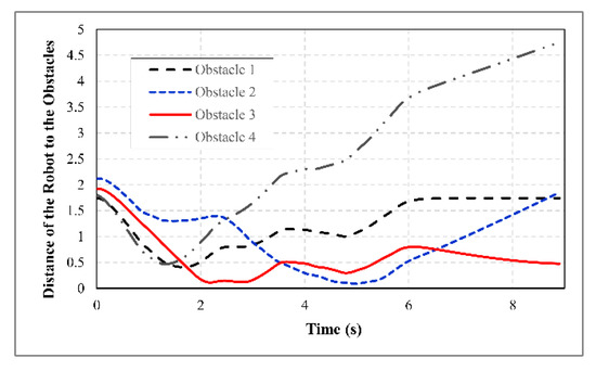 The distance of the robot from each obstacle during the robot motion is demonstrated in Figure 11, which shows the effectiveness of the developed control strategy in protecting the robot from collision with obstacles.