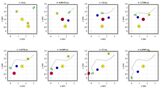 To assess the performance of the proposed control system and obstacle avoidance strategy in comparison with other methods, the robot‘s motion between fixed and moving obstacles is simulated for the Example 3 presented in [26]. The velocity and initial position of the obstacles are specified based on the data provided in [26]. In addition, the maximum allowable motors’ torque and the value of the viscous friction coefficient are specified as and in such a way that the maximum acceleration and velocity of the robot are equal to the values reported in [26] ( and ). In addition, considering , the value of parameters , and are calculated as 0.062 m, 1.57 s and 0.1374 m, respectively. Since the maximum obstacle‘s speed in this example was , the minimum value of is calculated from Equation (56) as . Using the initial and desired configuration of the robot, similar to [26], as and , the snapshot of the robot’s motion among the obstacles is obtained by the proposed method in this paper and depicted in Figure 18.