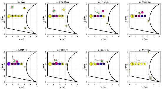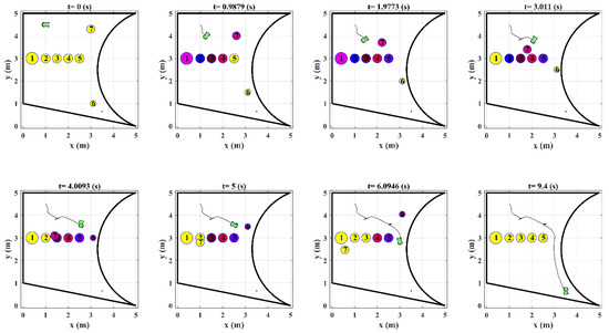To evaluate the effects of these parameters on the performance of the design control system, solving Examples 1 and 2 are repeated using different values of and . Figure 15 illustrates the snapshot of the robot’s motion in Example 1 for and .