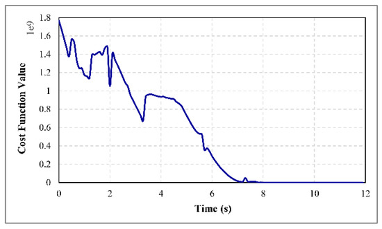 Figure 13 and Figure 14 demonstrate the variation of the optimal value of the cost function (Equation (40)) in Examples 1 and 2 obtained by solving the nonlinear constrained optimization problem in Equation (41) in each time step. It is obvious that the cost functions decrease in both cases to reach their global minima at zero, which is associated with the stabilization of the robot in desired position and orientation. However, the optimal value functions have some optimums and there are some points that the optimal value of the cost functions increases temporarily. These optimums are in fact the local minimums of the cost function in Equation (40) considering the position and velocity constraints in Equation (49) defined based on the workspace borders and collision avoidance criterion at the corresponding times. As explained mathematically in Section 3.3 by conditions in Equations (50) and (51), these local minima points are associated with the instants that the control system has to move the robot in opposite direction of the target position to ensure that the position and velocity constraints are not violated by the robot motion.