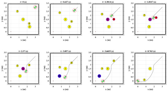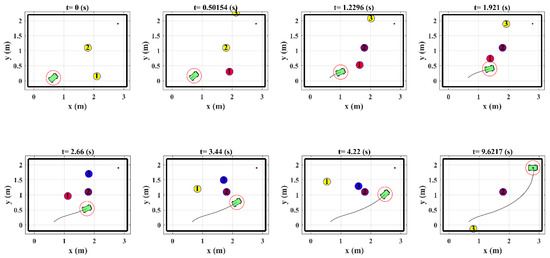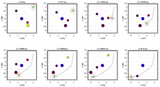 Figure 9 shows the snapshot of the robot trajectory in the presence of obstacles in which the inactive obstacles are shown by yellow color and the workspace boundaries are demonstrated by black lines. The figure shows that the arrangement and motion of the obstacles are such that the conditions in Equations (50) and (51) are satisfied and there exist a trajectory in each time step that the robot could become much closer to the target position.