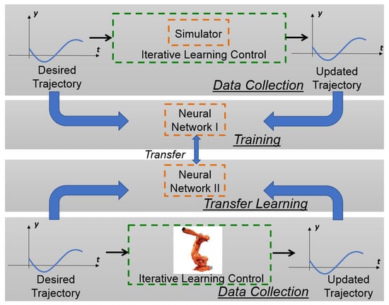 Trajectory tracking control of robot manipulators is a well-studied problem []. The typical control architecture is based on joint torque control, which is challenging to implement on industrial robots. The controller structure usually consists of a linear stabilizing feedback controller and a feedforward compensation for trajectory tracking. Asymptotically perfect tracking is achieved by adaptive control [], given that the robot dynamics are expressed in the linear-in-parameter form. However, accurate dynamics information for a robot is rarely available in practice. In this case, either simplified reduced-order models are identified [], or machine learning techniques including wavelet networks, Gaussian Processes, and fuzzy logic systems [] are utilized to approximate a sophisticated model for controller design. Iterative learning control (ILC) [,] relaxes the requirement of model information, but the learned representation is not transferable between different trajectories. Recently, neural network (NN)-based [] controller design has attracted a great deal of attention with its potential ability to generalize beyond the training set. A detailed review of neural-learning control is presented in Section 2.