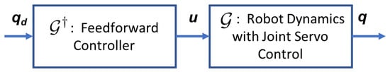 Consider an n-dof robot arm under closed-loop joint servo control with input , typically either the joint velocity command or the joint position command , and the output , the measured joint position. The inner-loop dynamics, , is a sampled-data nonlinear dynamical system possibly with communication transport delay and quantization effects. Our goal is to find a feedforward compensator (as shown in Figure 2) such that, for a given desired joint trajectory , the feedforward control would result in asymptotic tracking: , as .