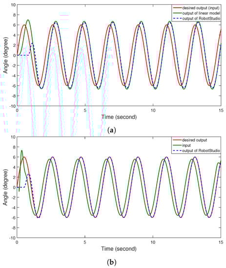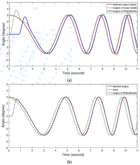 As multiple sinusoids were used in the training of the NN (with discrete angular frequencies ranging from 0.5 to 15 rad/s), we tested its generalization ability on a chirp (multi-sinusoids) that was not part of the training set (with continuous angular frequencies ranging from 0.628 to 1.884 rad/s). Figure 6 illustrates the result for joint 1 of the simulated robot with NN compensation. Figure 6a shows the uncompensated output with the robot output lagging behind the desired output. The nonlinear effects are denoted by the deviation of the linear model output from the RobotStudio output. Figure 6b shows that, by compensating for the lag effect and amplitude discrepancies, the command input generated by the NN drives the output to the desired output closely after a brief initial transient.
