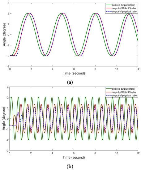 Comparison of responses between RobotStudio (red curve) and the physical robot (blue curve). Desired inputs are sinusoids with amplitude of 2° and angular frequency ω of 2 rad/s (a) and 10 rad/s (b). (a) RobotStudio captures the dynamics of the physical robot well when commanded a slow trajectory. (b) Discrepancy exists between RobotStudio dynamics and the physical robot when commanded a fast trajectory.