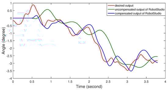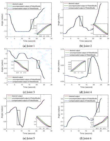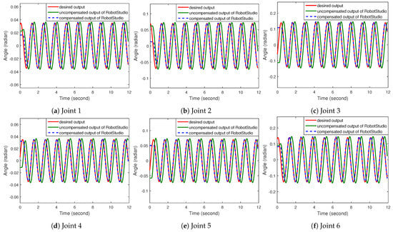 To further test the generalization capability of the trained NNs, we conducted another test of tracking 6-dimensional joint trajectories planned by MoveIt! for a large-structure assembly task [] in RobotStudio. The comparison of tracking performance without and with NN compensation is shown in Figure 9. Table 4 reports the corresponding tracking errors.