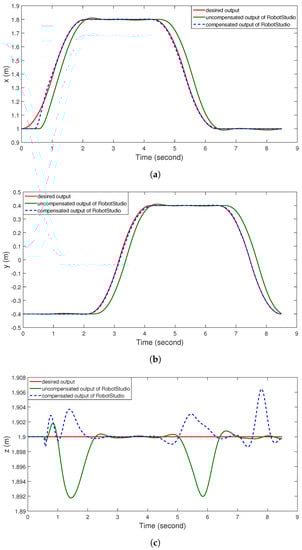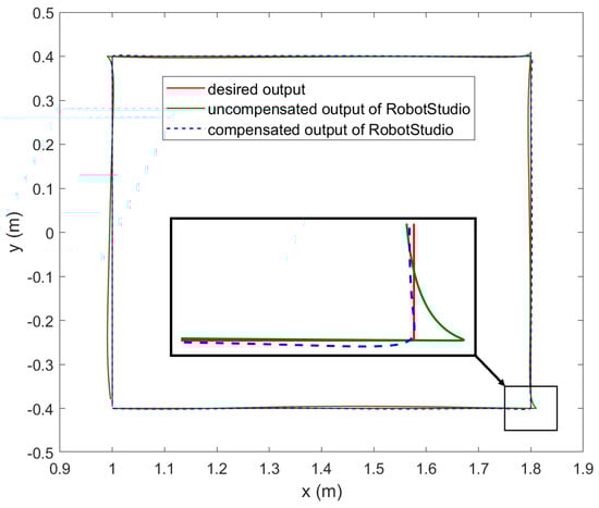 Comparison of tracking performance without and with the NN compensation of a Cartesian square trajectory in the x-y plane with z constant in RobotStudio. The improved tracking performance of each Cartesian axis is reported in Table 5.
