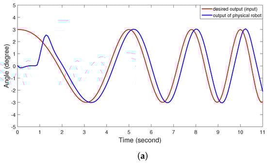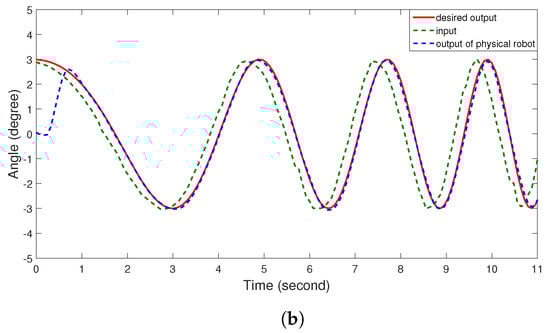 However, for trajectories with large velocity and acceleration profiles, transfer learning plays a key role in generating an optimal input to reduce trajectory tracking errors for the physical robot. Figure 13 illustrates the tracking of a sinusoidal signal with an angular frequency of 8 rad/s (with different amplitude and phase from the training data). The comparison between Figure 13b,c demonstrates that transfer learning is necessary to correctly compensate for the phase lagging and magnitude degradation for the physical robot given an aggressive motion profile. Table 7 summarizes the corresponding norms of tracking errors.