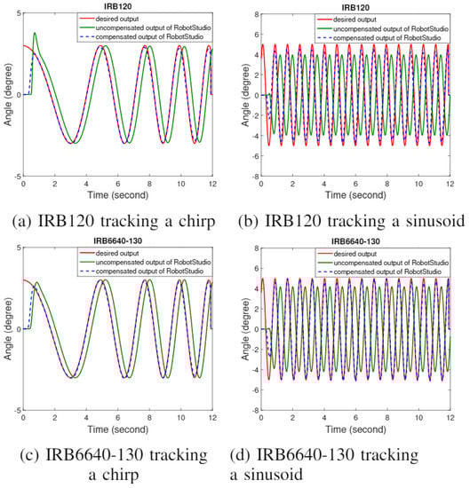One natural question that arises is whether the trained NNs also work on different robot models. We applied the trained NNs by simulation data to two robot models IRB120 and IRB6640-130 in RobotStudio, and tested their tracking on a chirp trajectory (the same one as we used in Section 5.1.1) and a sinusoidal signal with an angular frequency of 8 rad/s and a magnitude of 5 degrees, as shown in Figure 14.