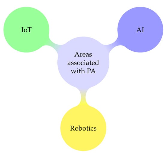 Fortunately, to overcome the challenges imposed by population growth, accelerated urbanization, high competitiveness of high-quality products, lack of qualified labor and the vulnerability of human labor to situations of health risk, scientific advances in different areas of human knowledge are transforming the way of managing agricultural activities, increasingly reducing human intervention. According to [9], the term Precision Agriculture (PA) can be defined as “that kind of agriculture that increases the number of (correct) decisions per unit area of land per unit time with associated net benefits”. This definition is more generic so that decision-making can be done either by electronic devices or humans. On the other hand, in [10] the PA is described as being “a management strategy that uses electronic information and other technologies to gather, process, and analyze spatial and temporal data for the purpose of guiding targeted actions that improve efficiency, productivity, and sustainability of agricultural operations”. This definition clearly describes the use of technologies as a means of improving agricultural operations. In this review work, these technologies were grouped into three main areas: robotics, Artificial Intelligence (AI) and Internet of Things (IoT). These technologies can be used either alone, or together, according to Figure 1.