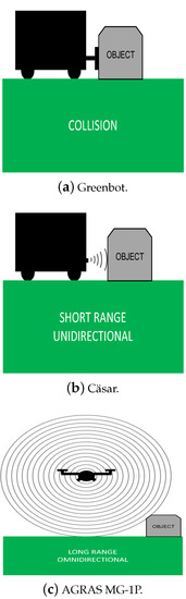 As it is considered a semi-structured environment, to navigate the entire farm with precision in its positioning data, all the robots previously discussed present the integration between the RTK system and the GNSS. Therefore, in the aspect of control of robots in real agricultural environments, it is noted that, through the use of RTK/GNSS technologies, there has been a great improvement in the control of location and positioning of robots, compared to the review article published in 1987 [20], since RTK technology emerged in the mid-1990s. Figure 3 exemplifies the difference between the obstacle detection systems of the robots listed in Table 1.