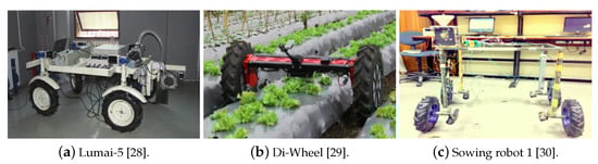 Motivated to produce a small, high precision and capable of agile and easily moving along Chinese wheat farms, Haibo et al. developed the Lumai-5 robot, as shown in Figure 4a. For this type of task, the robot must ensure that the sowing process remains constant, even for different speeds of detachment. The Lumai-5 robot has a 4WS, a closed-loop control system and speed, angle and pressure sensors to accurately carry out wheat sowing. The size of the planting tray, the vacuum chamber pressure and the planting speed were the main factors that directly affected the seeding quality [28].